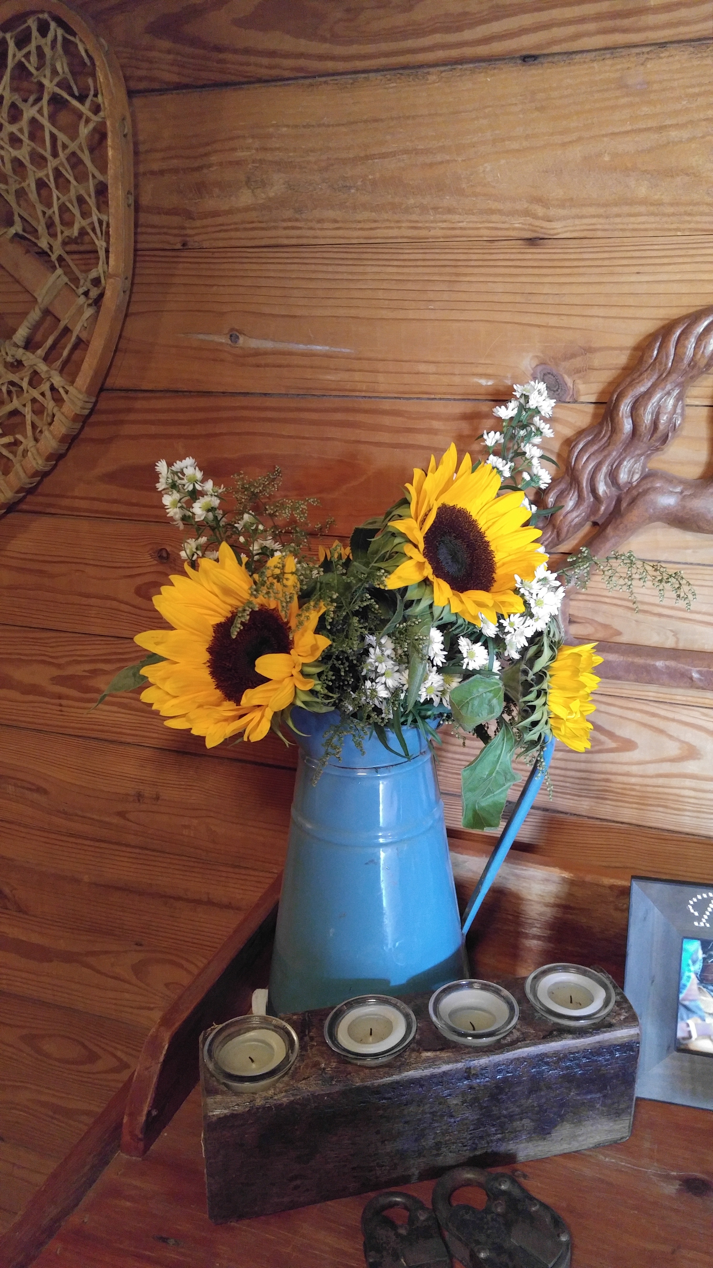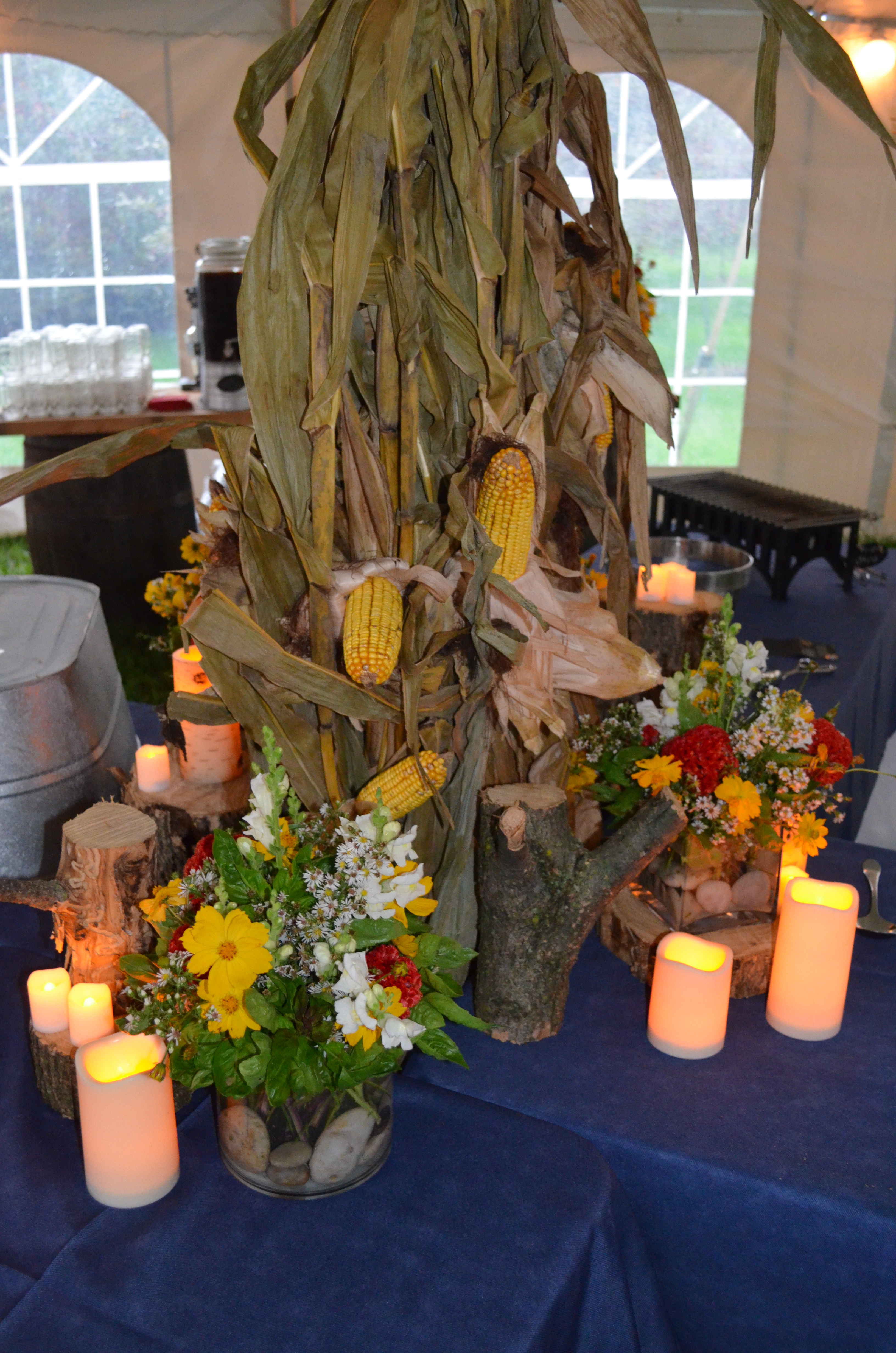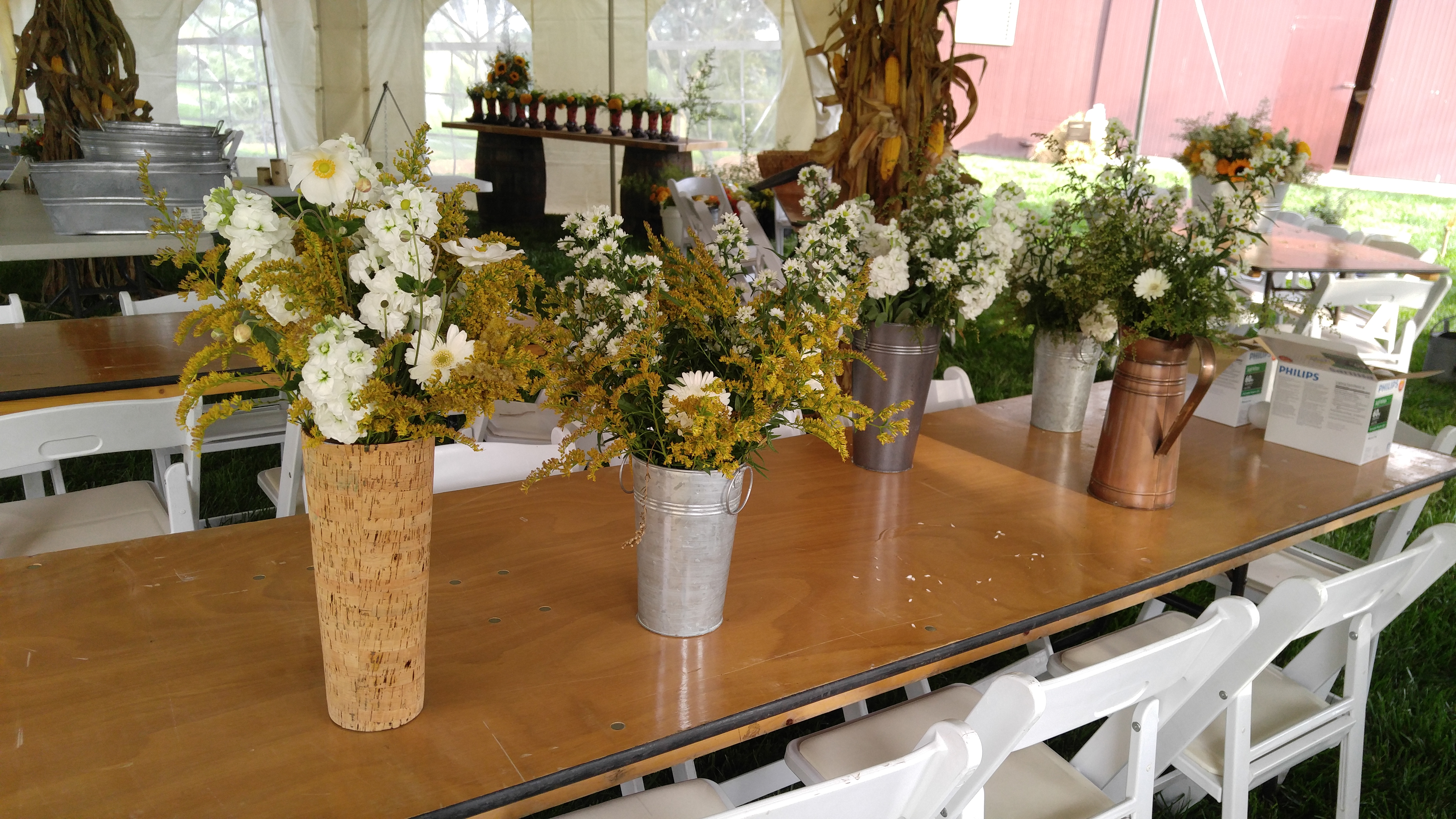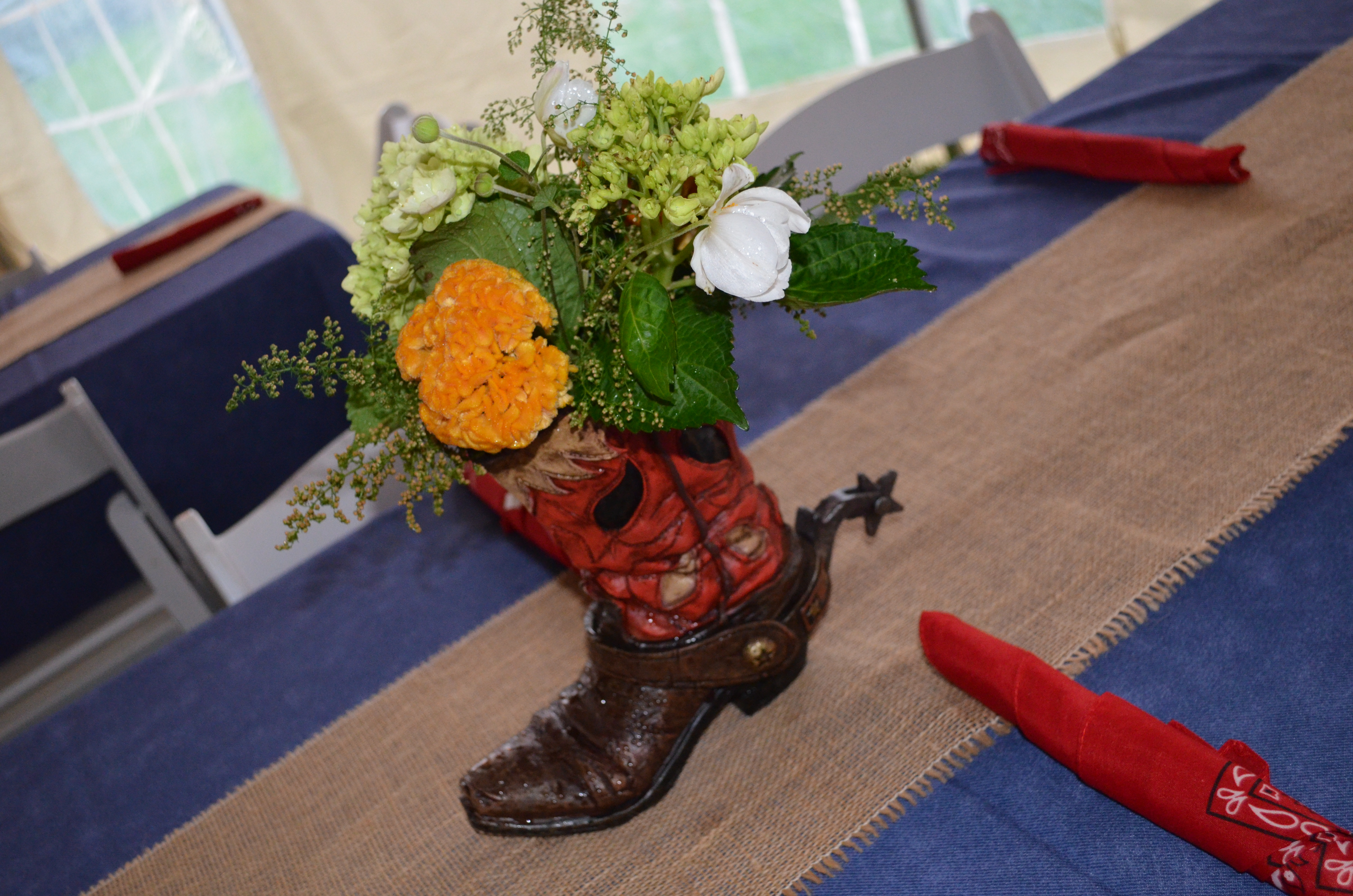 The Hoe-Down was a country-themed party held in a historic barn located on the estate. The event included dinner, drinks, and square dancing. Country-themed attire was encouraged, included cowboy hats and boots, flannel, plaid, and denim. The flower arrangements for the event were casual, natural, and simple. Sunflowers were specifically requested. The color scheme was mostly yellow and white, with hints of red.